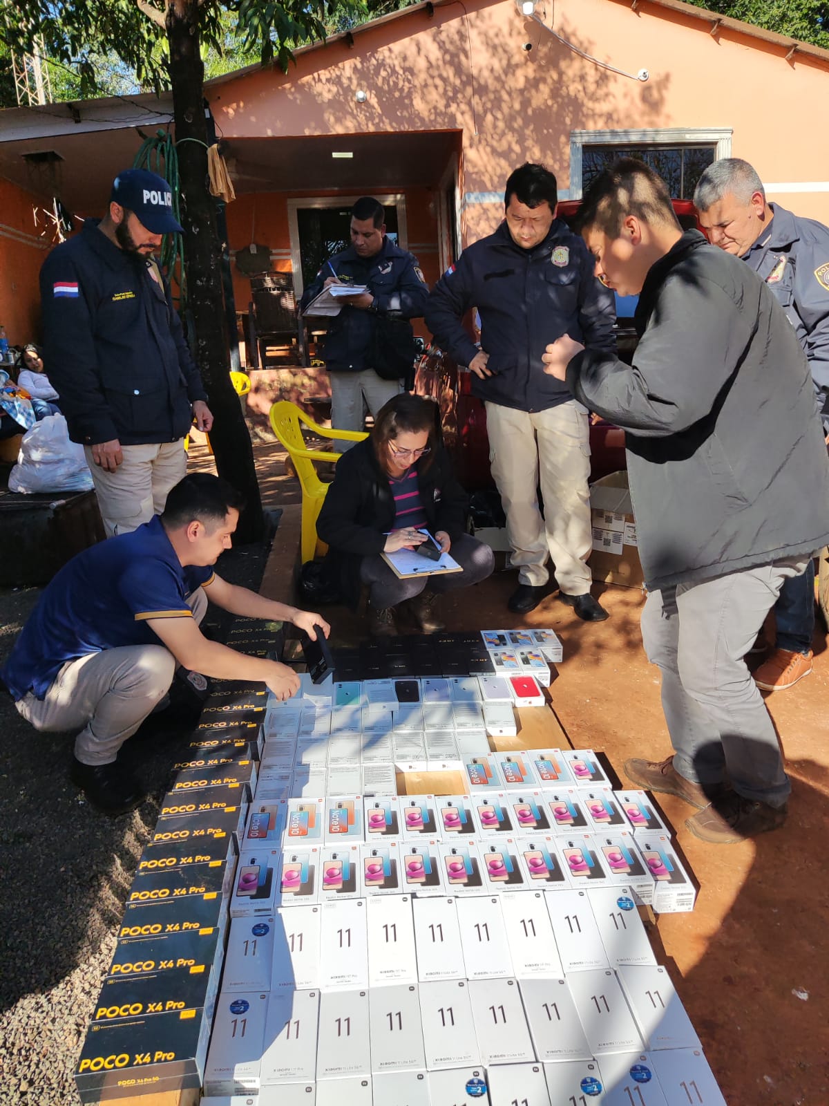 l primer allanamiento se realizó en una vivienda ubicado en el Barrio San Alfredo, en el domicilio de Rosana Fabiola Faria Vázquez (35) pareja del ahora aprehendido Marcelino Arguello, los intervinientes procedieron a la verificación de la vivienda especialmente un vehículo que se encontraba estacionado en el patio de la vivienda , un Toyota, modelo premio ,color rojo, en cuya valijera encontraron varias cajas de cartón ,cuyo contenido 130 celulares iPhone, el vehículo encontrado registrado a nombre de Mabel Vera Chamorro con domicilio en villa San Francisco de Hernandarias, también fueron incautados un automóvil corolla , blanco chapa AACU 035 a nombre de Cristian Villalba Torres domiciliado en el barrio Remansito, este utilizado presumiblemente para la consumación del hecho investigado.