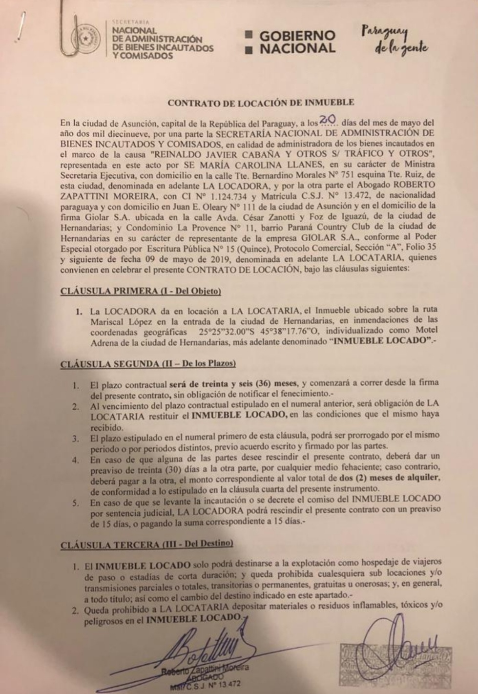 Antiguament Alquilado por el Abogado Roberto Zapattini Moreira quien es apoderado de la empresa Gio S.A. El acuerdo es entre Senabico y el abogado Roberto Zapatini Moreira quien ya tiene a su cargo 3 Moteles, dos en Cuidad del Este y uno en Hernandarias