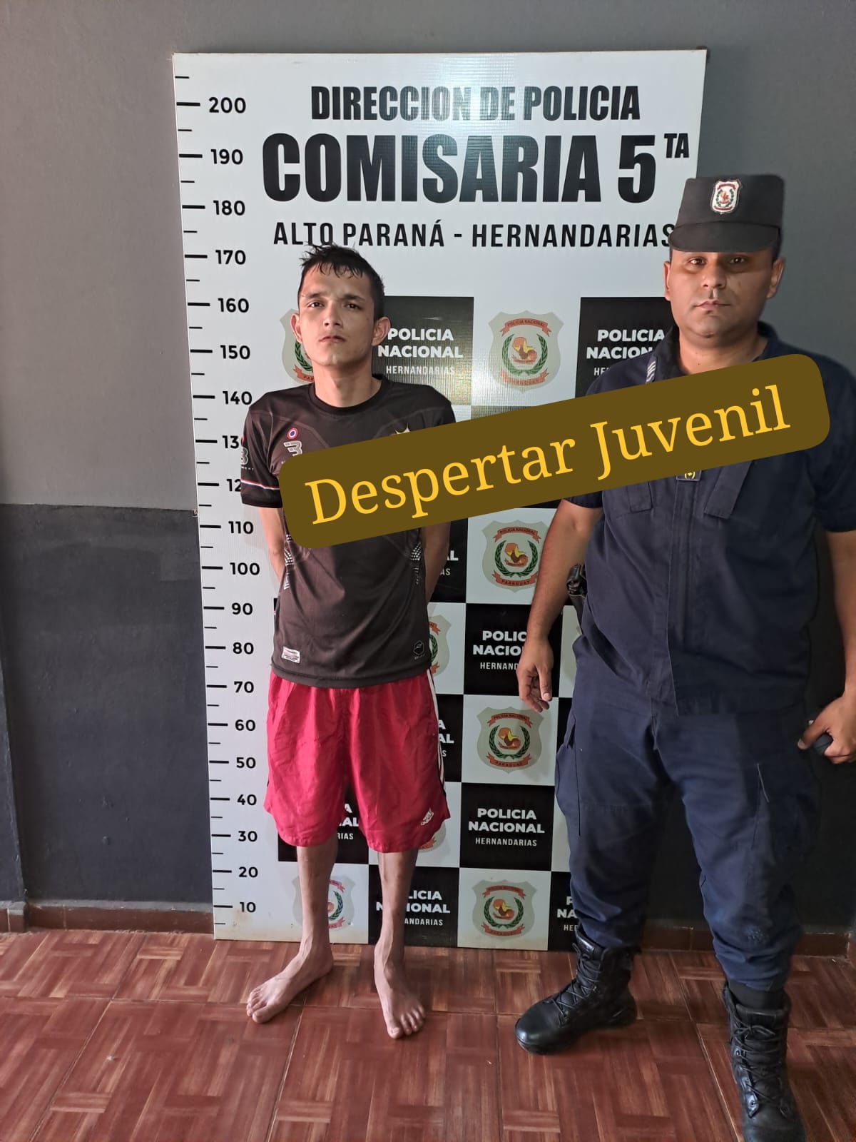 La aprehensión se dio el día de hoy a las 13:00hs en el barrio Primero de Marzo de Hernandarias, dejando aprehendido a Juan Alberto Martinez Portillo de 25 años el mismo cuenta con antecedentes penales en relación a las siguientes causas: 1) S.H.P. contra la propiedad (hurto agravado), año 2017; 2) S.H.P. contra la propiedad (hurto agravado), año 2020; y 3) S.H.P. contra la propiedad (robo agravado), año 2025.