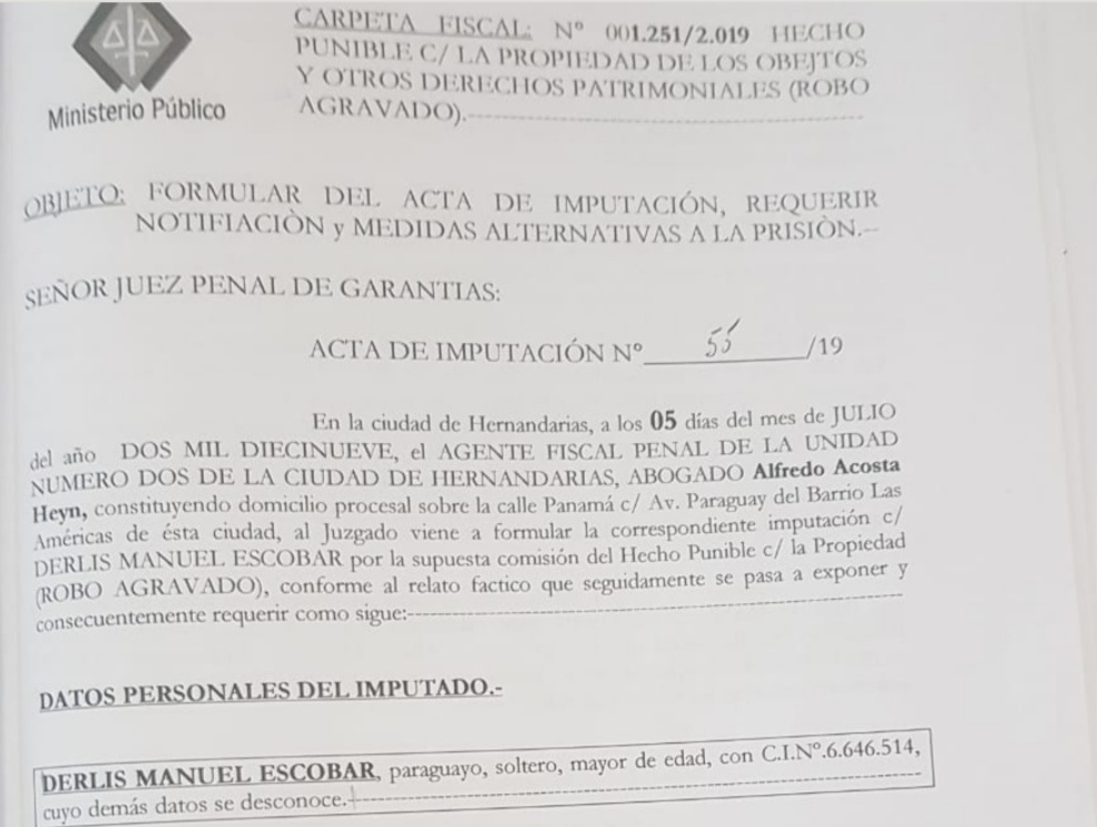 Derlis está siendo buscado nuevamente por la Policía Nacional quien cuenta con frondosos antecedentes, uno de ellos el asalto en el Barrio Área 6 meses atrás con toma de rehén como el robo de un vehículo en el Hospital Distrital de Hernandarias , y varios otros asaltos en la vía pública, siendo capturado por la Policía Nacional en la ciudad de Caazapá. Finalmente por pedido del Fiscal Alfredo Acosta Heyn fue puesto en libertad con medidas alternativa y fue concedido por el Juez Penal Abg Cesar Víctor Narváez del Distrito de Yhú Distrito de Caazapá.