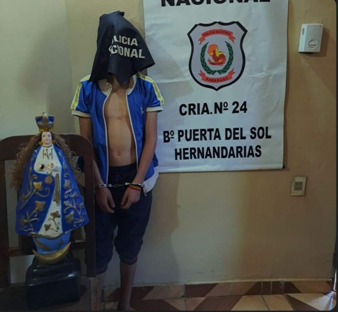 Del poder del adolescente de 16 años se recuperó una imagen de la Virgen de Caacape, de unos 70 centímetros de altura, propiedad de Edgar Fidelino Galeano Velázquez, domiciliado en el asentamiento Amanecer del municipio hernandariense.