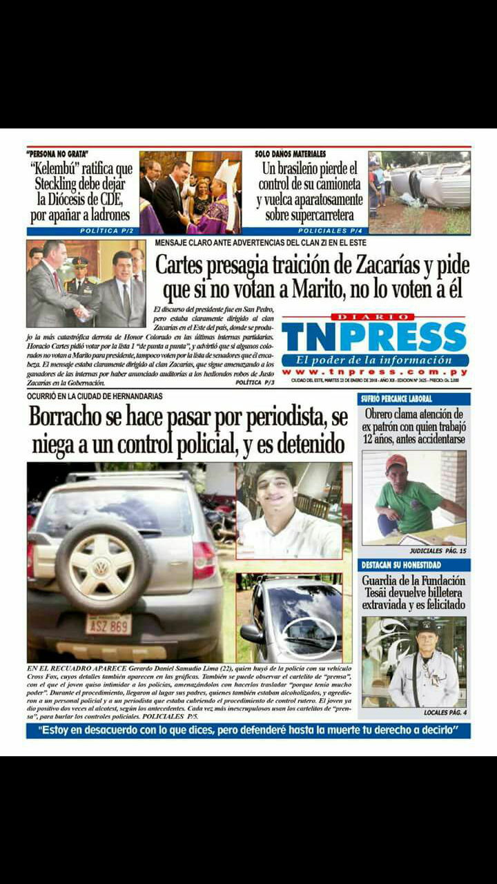 En el mes de Enero de este año, el mismo vehículo había protagonizado una larga persecución policial y fiscal donde huyó de un control y en el momento estaba al mando Geraldo Daniel Samudio Lima quien usaba un logotipo de Prensa para evitar controles e intimar a la Policía Nacional.