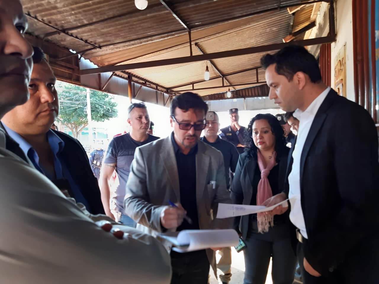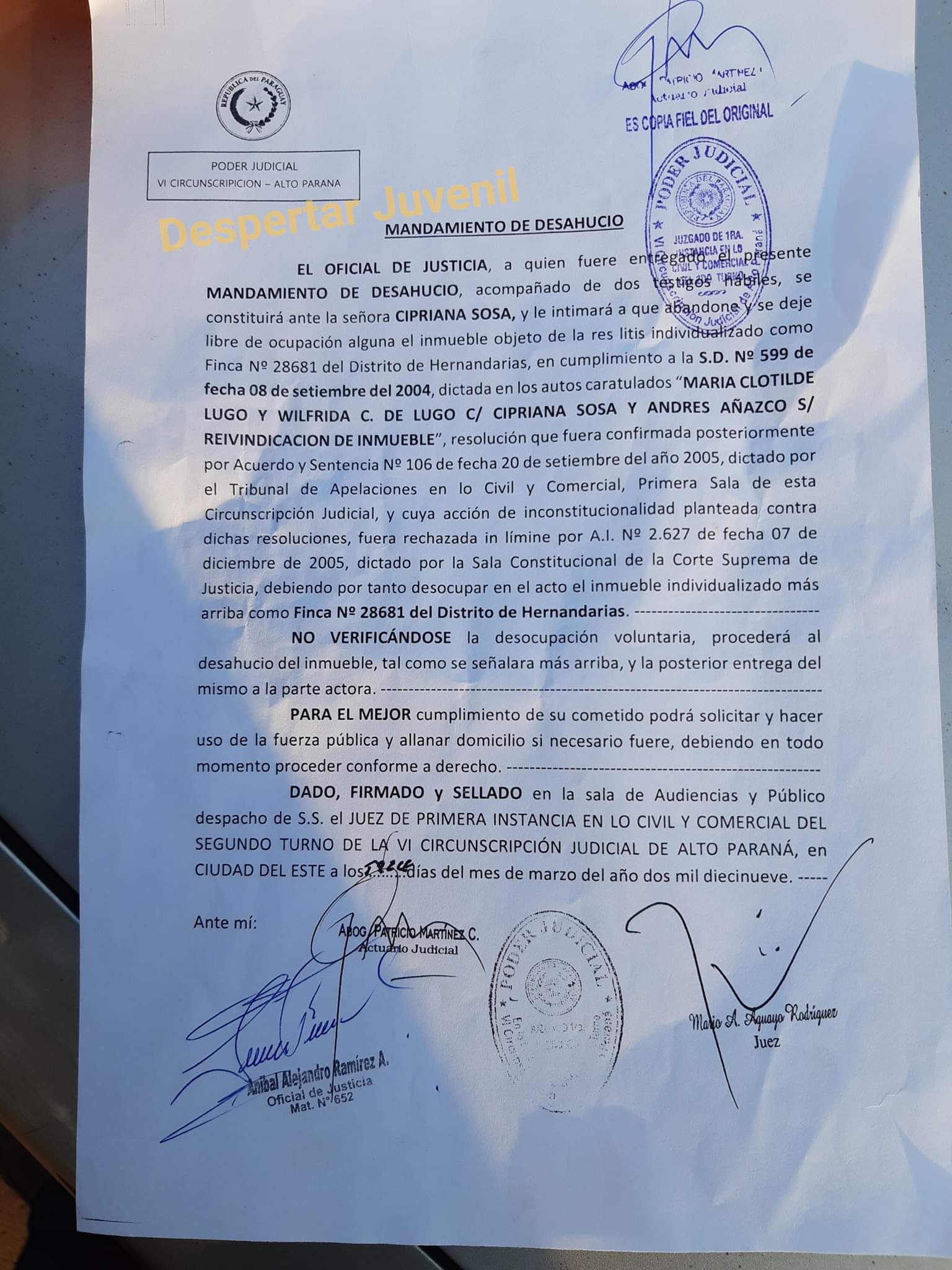 Gran cantidad de Policías entre Abogados, funcionarios Judicial llegaron con un Mandamiento de Desalojo en los autos caratulado «María Clotilde Lugo y Wilfrida C. de Lugo C/ Cipriana Sosa y Andrés Añazco S/ Reinvidicacion de inmueble firmado por el Juez Abg. Mario Aguayo Rodríguez y el actuario Abg. Patricio Martínez.