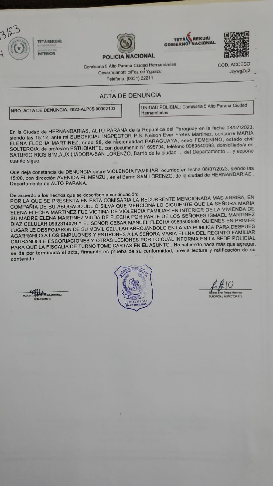 Los mencionados habían sido denunciados en julio pasado de 2023 por violencia familiar, ambos supuestamente habían golpeado brutalmente a la víctima María Flecha (60) quien sería hermana de César y sobrina del Director del colegio, según la denunciante ambos la había agredido físicamente y verbalmente por disputa a una herencia que había dejado la madre ya fallecida. La víctima había realizado su denuncia ante la comisaría 5ta de Hernandarias pero el caso no trascendió ya que según el representante legal de la mujer manifestó que estos vienen chicaneando logrando 4 cuatro veces la suspensión de imposición de medidas.
