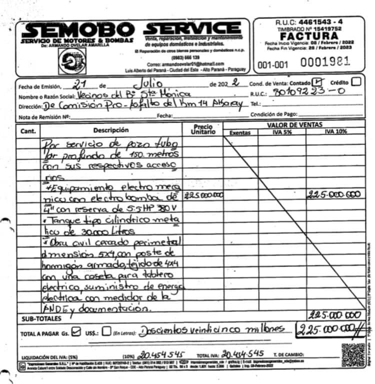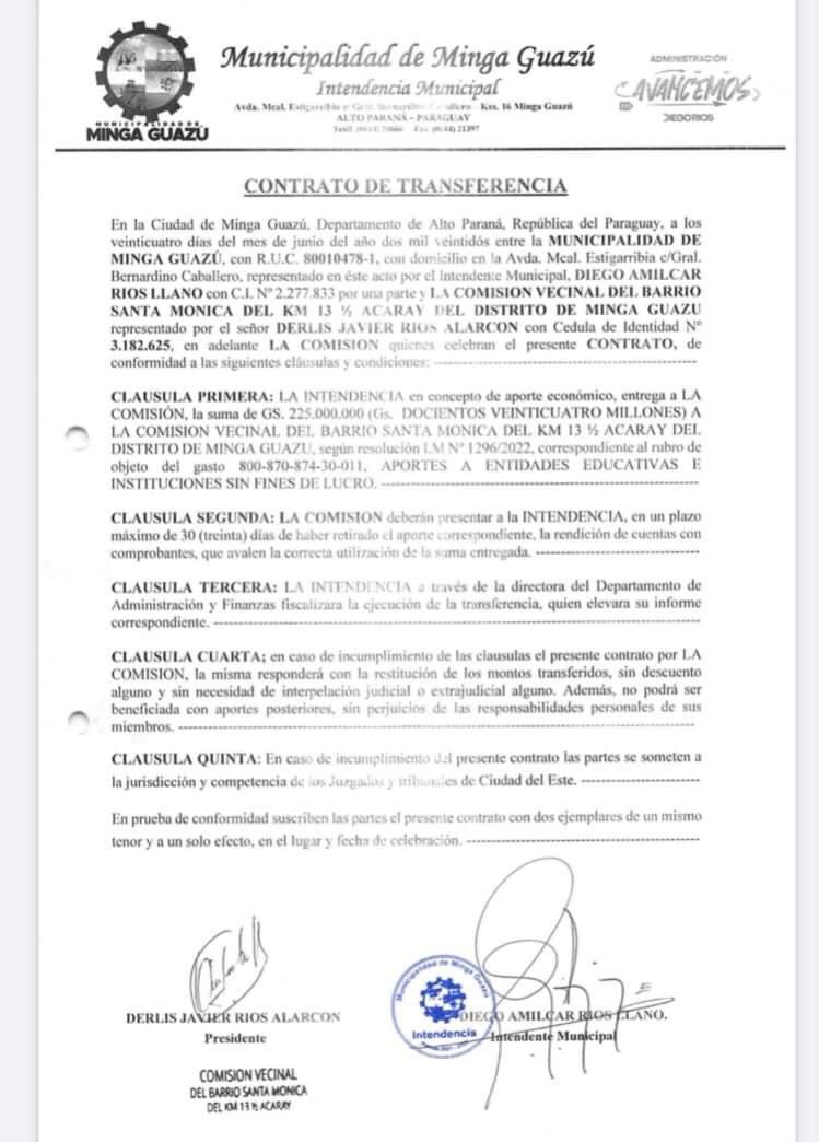 El Intendente Diego Ríos de Minga Guazú estaría supuestamente sobrefacturando pozos artesianos utilizando el rubro 871, de transferencia de capital a comisiones vecinales.
