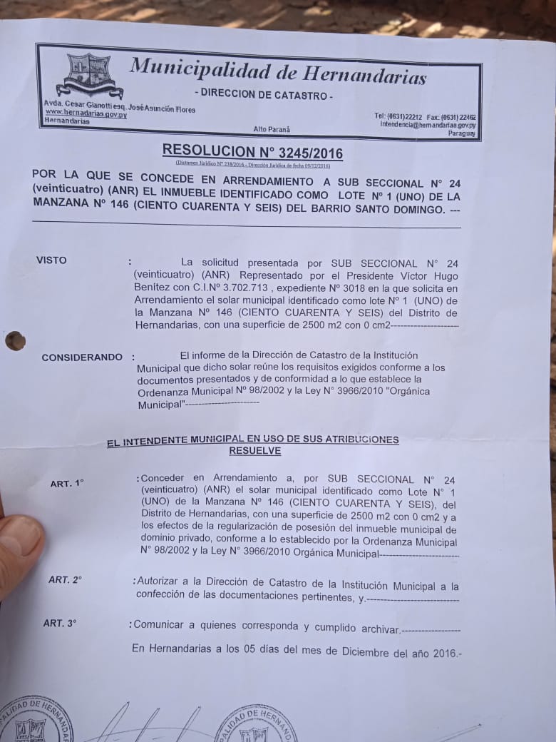 También manifestó que dicha cancha de fútbol que se encuentra en el predio es utilizado constantemente por personas que realizan diferentes actividades que es de utilidad. Por otra parte facilitó imágenes de documentos del año 2016 donde demuestra que habían pagado el arrendamiento hasta ese período, pero que luego se enteraron a traves de la municipalidad que se había revocado.