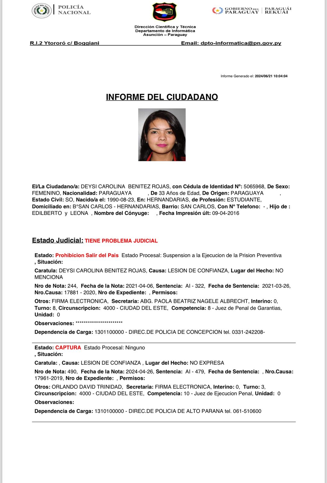 La imputada y buscada por la Justicia Paraguaya, sigue aun profuga pero libremente por la Ciudad de Hernandarias, sin que la Policía Nacional tenga la molestia de dar su detención. La misma según fuentes supuestamente fue varias veces capturada pero atraves de llamadas logra safarse sin algún problema. La misma tiene remisión directa a la Peníntenciaria de mujeres Juan Maria de lara de Ciudad del Este.