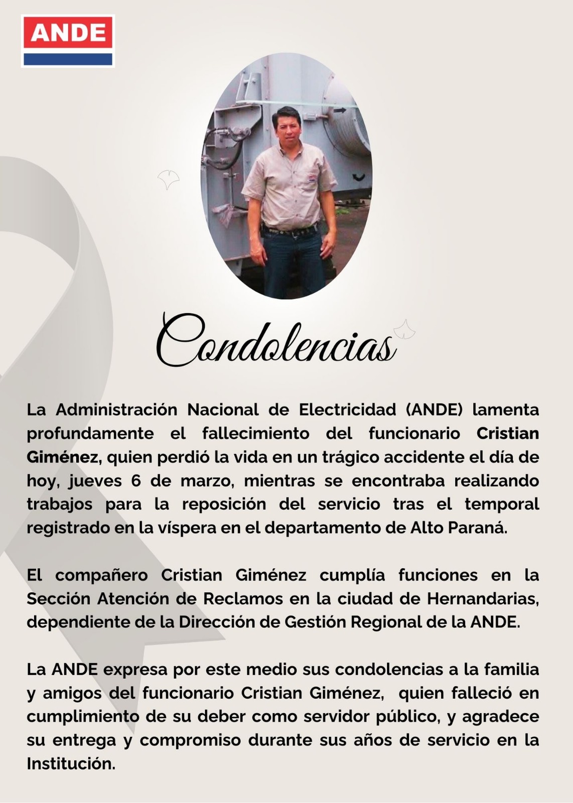 Este lamentable suceso pone en evidencia los riesgos que enfrentan los trabajadores que realizan labores en el tendido eléctrico, y ha generado conmoción entre los compañeros de Giménez y la comunidad de Hernandarias. Las autoridades de la ANDE aún no se han pronunciado oficialmente sobre el caso, pero se espera que se tomen medidas para reforzar las normas de seguridad y prevenir futuros accidentes.