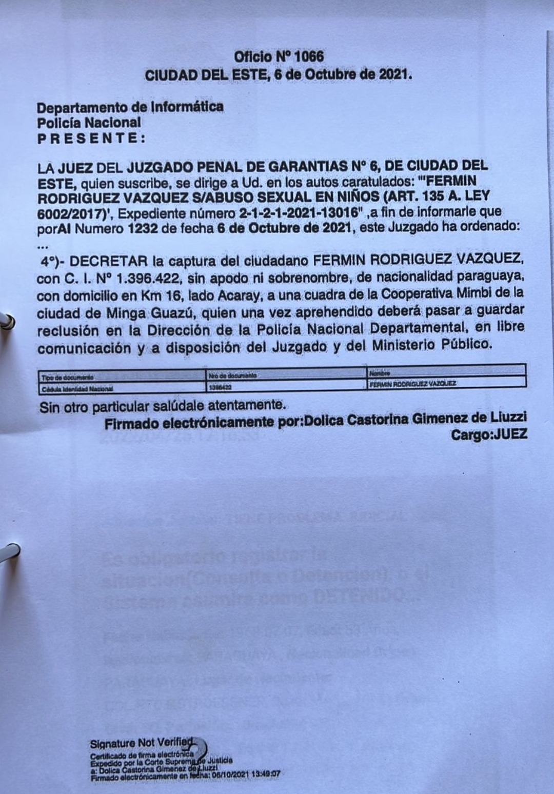 Un terrible hecho fue denunciado en la Ciudad de Minga Guazu, donde los Hermanos Pantaleon Rodriguez Vazquez y Juliana Rodriguez Vazquez estaría queriendo vender un terreno ubicado en el km17 Acaray de Ming Guazu, con la Intención de la venta seguir ayudando al prófugo Fermin Rodriguez Vazquez (53) quien posee Orden de Captura por Abuso sexual en Niños.