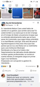 Manifestó la mujer en las redes Sociales textualmente » Señor Intendente usted hablo de cambio cual sería eso? como para nombrar a su Nuera e hija en dos sectores muy delicados , sin ser profesionales en el área usted no tuvo méritos en nombrar primero a sus familiares» . Por otra parte los internautas también respondieron a la publicación preguntándole por qué no da oportunidades a profesionales en el área » y mencionado por ejemplo de cómo una diseñadora de modas puede ser Directora de Codeni sin tener ningún conocimiento en el área donde desarrollara sus funciones.