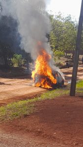Según su propietaria que a la hora señalada más arriba transitaba por la calle sin denominación del Barrio 13 de Junio, momento que tuvo problemas su rodado y paro el motor y al tratar de poner nuevamente en contacto se originó el fuego en la parte delantera, aparentemente por problemas en las instalaciones eléctricas, inmediatamente la misma descendió de su rodado, en cuyo interior quedaron sus documentaciones las cuales fueron consumidas por el fuego. Se convocó en el lugar a personales del Cuerpo de Bomberos Voluntarios, a cargo de la voluntaria- *ROSANA BRIZUELA..