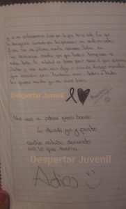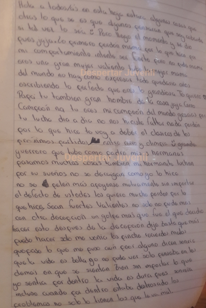Papà tu también gran hombre de la casa jaja Cerro Campeón na tu eres mi campeón del mundo gracias por tu lucha dia a días no nos hiciste faltar nada perdón por lo que hice te voy a deber el clásico de los próximos partidos entre cerro y Olimpia grande guerrero que tuve como padre mis 3 hermanas pasamos muchas cosas también mi hermanito luchen por su sueños no se decaigan como yo lo hice no se pelen màs apóyense mutuamente sin importar el defecto de ustedes los quiero mucho perdón por los que hice, Sean fuertes valientes no solo no pude mas con otra decepcion un golpe mas que fue el que decidio hacer esto después de la decepcion dije basta que mas puedo hacer solo se venia los pinche recuerdos malos que paso lo que me puso aun peor algunos dicen sonríe que la vida es bella yo no pude ver solo pensaba en los demás en que se sientan bien sin importar lo que yo sentía por dentro la vida es dura pues sonreía incluso cuando por dentro estaba destrosado los problemas no solo lo tienen los que le va mal.
