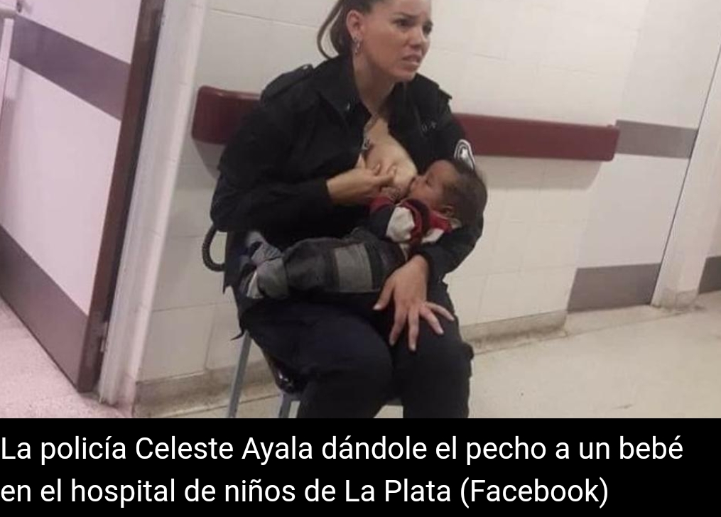 Sentada en un pasillo con su uniforme de policía y amamantando a un bebé. Celeste Ayala, agente de la Bonaerense, estaba de servicio en elhospital de niños de La Plata y al notar que el llanto del pequeño no paraba, pidió permiso para darle el pecho. La imagen, subida a las redes sociales por un compañero, se viralizó en Facebook de inmediato.