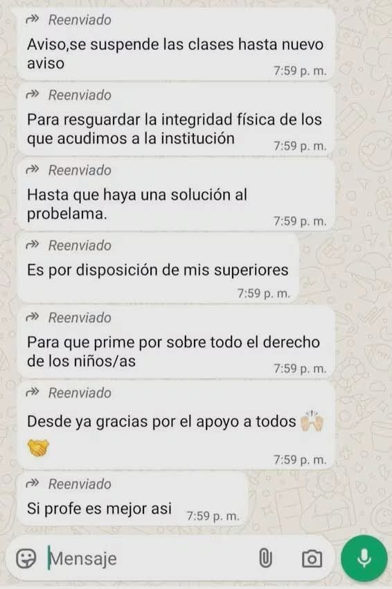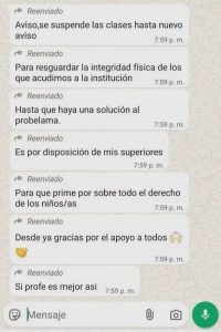 A través de WhatsApp, informó en el grupo de padres de familia, Aviso: Se suspenden las clases hasta nuevo aviso. Para resguardar la integridad física de los que acudimos a la institución. Hasta que haya una solución al problema. Para que prime el derecho de los niños”, escribió.