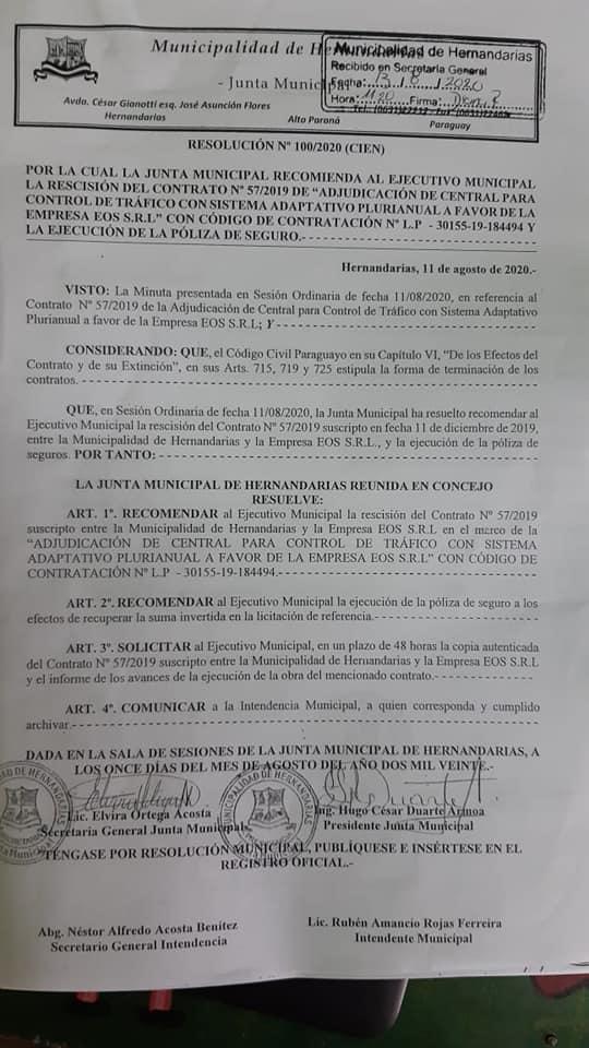 Los concejales Alberto Baez, Alcira Cáceres, Demetrio Soler, Carlos Rojas, Wilson Ayala y Jhon Florentin de un comienzo se opusieron a la instalación de semáforos ya que argumentaban qué la empresa EOS sería de maletín, sin capacidad económica no técnica para un proyecto de estas envergadura.