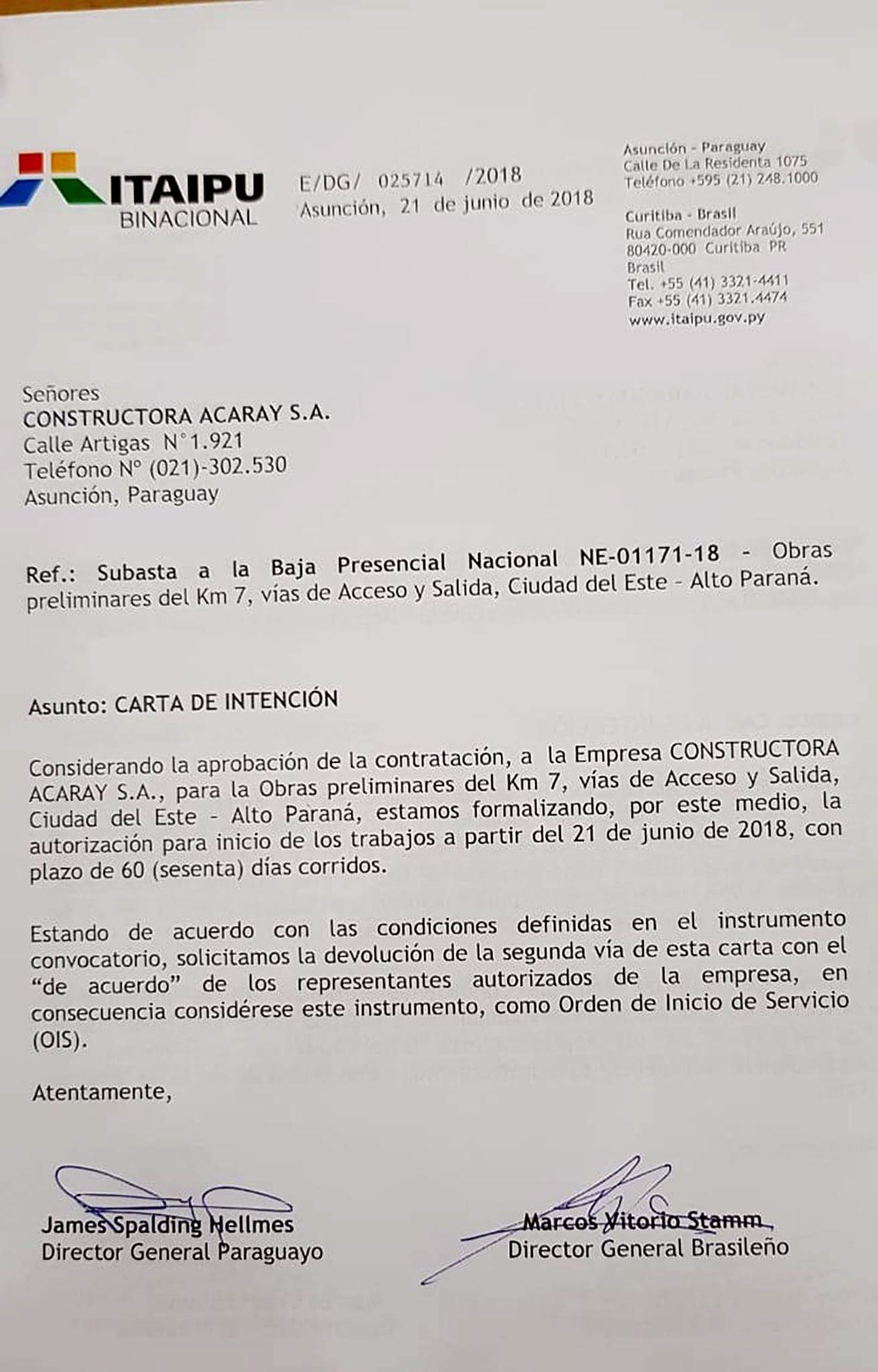 La orden de trabajo ha sido ya enviada por el director paraguayo de la Itaipú James Spalding a la empresa Constructora Acaray S.A., tras la subasta a la baja presencial nacional NE-01171-18. Cabe resaltar que esas vías si bien son consideradas “alternativas” en el momento de las obras, son en muchos casos avenidas que serán asfaltadas y habilitadas de tal modo que quedarán como importantísimo valor agregado para varios sectores cercanos al km. 7.