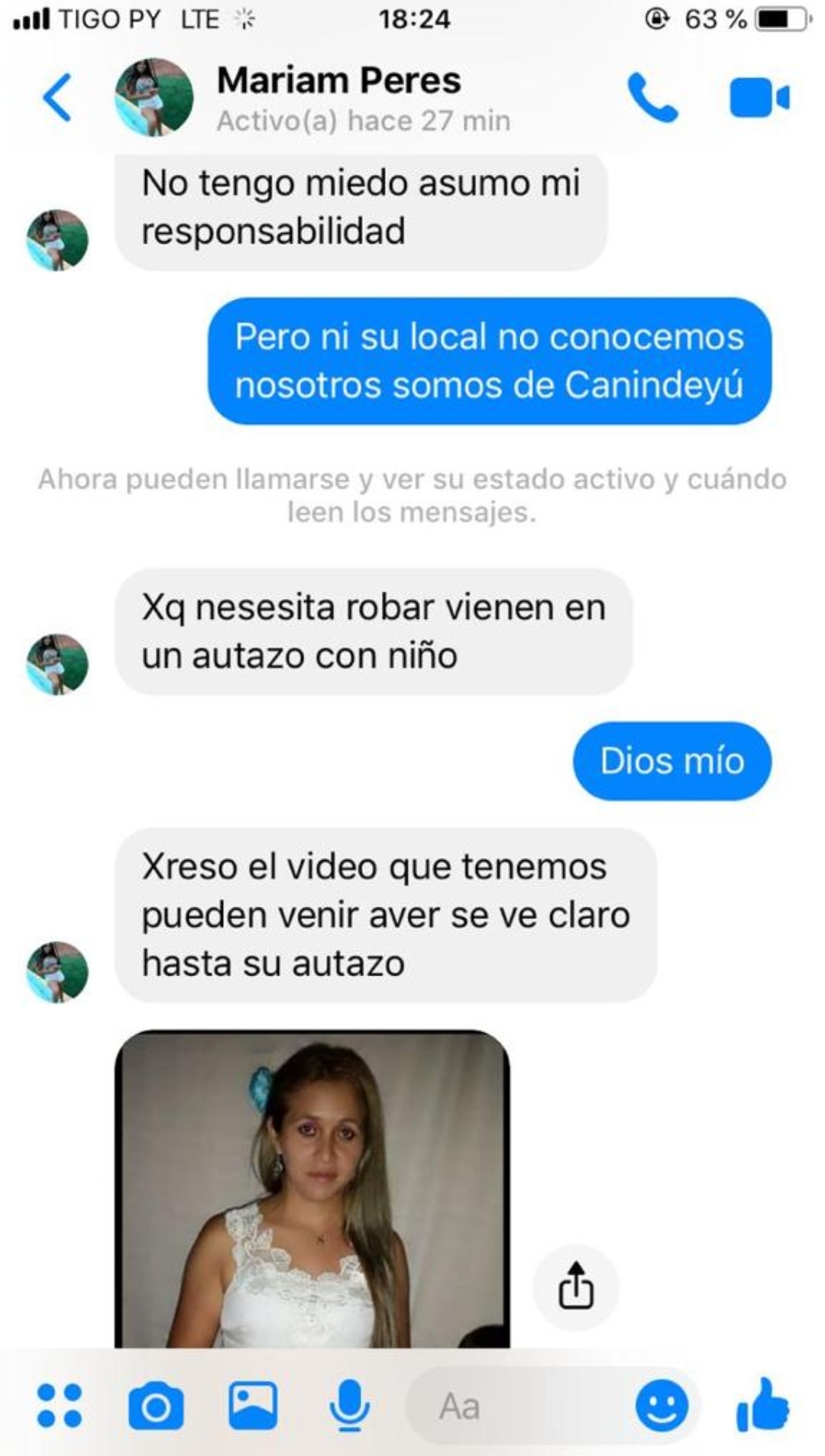 «A través de mi abogado hablamos con la señora Mirian pero sigue insistiendo que soy yo, pero no estuve ese día en Hernandarias como se puede apreciar en las cámara de mi local donde trabajo y acusó sin saber bien las cosas menciono» Zoraida se Jesús.