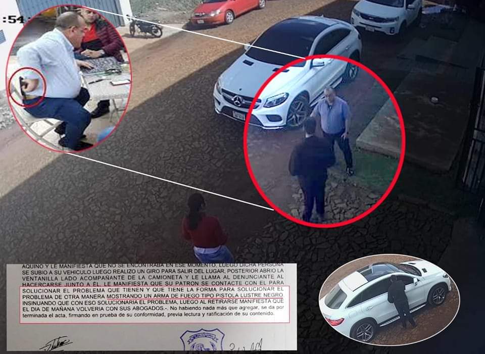 El comerciante Vladimir Ramón Riveros Cattebeke, con varios antecedentes penales y policiales, una vez más fue denunciado por un hecho de coacción grave y amenaza de muerte, cuya víctima es el empresario Eduardo Aquino González. El jueves, pasado el mediodía, Riveros fue hasta la empresa Gabesa, situada en el Km 15, 5 Acaray de Minga Guazú, descendió de su camioneta y preguntó por el denunciante a un empleado que le manifestó que no se encontraba.
