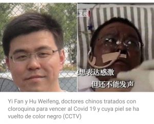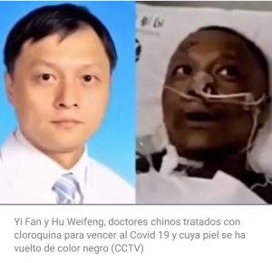 Se trata de los médicos Yi Fan y Hu Weifeng, de 42 años, que fueron tratados con cloroquina para vencer al Covid 19 y que han tenido una reacción poco común hasta el momento: el tono de su piel se ha oscurecido tal y como se ve en las imágenes grabadas de la televisión pública china.