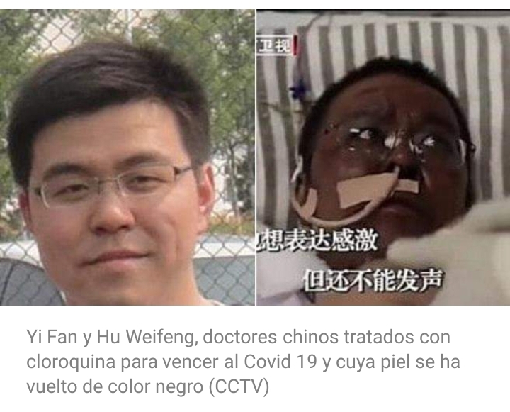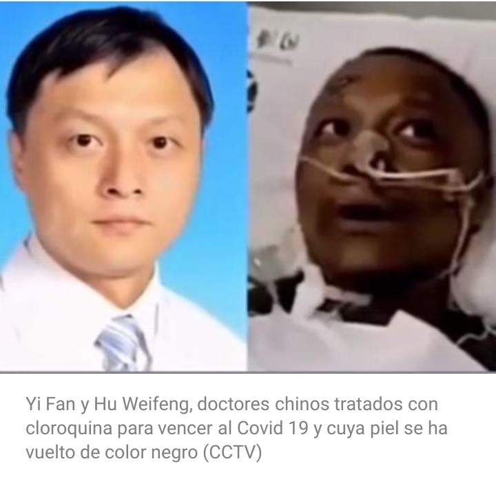 Se trata de los médicos Yi Fan y Hu Weifeng, de 42 años, que fueron tratados con cloroquina para vencer al Covid 19 y que han tenido una reacción poco común hasta el momento: el tono de su piel se ha oscurecido tal y como se ve en las imágenes grabadas de la televisión pública china.