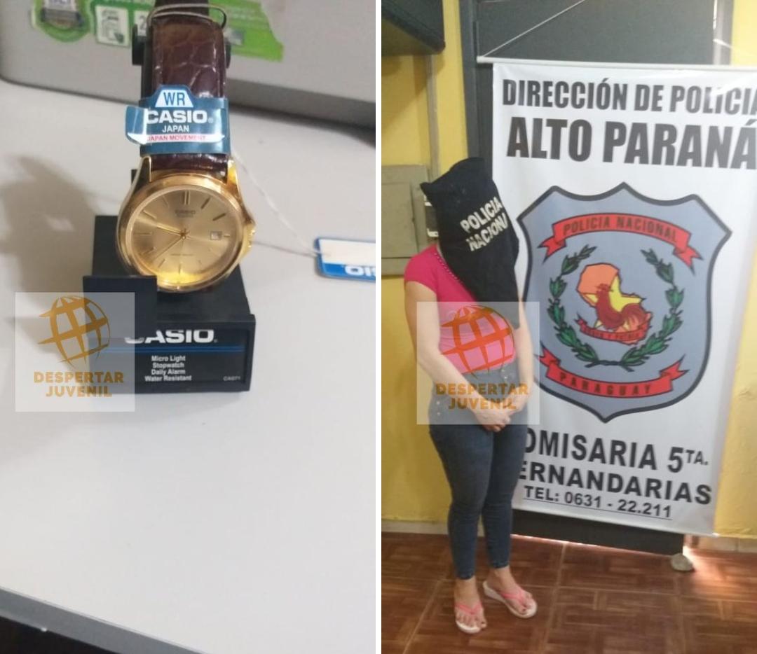 La víctima Elaine Balbina Cantero Caceres (18) realizó la denuncia Policíal donde se logró la Aprehensión de Mirta Raquel Salinas Ramírez donde tenía en su poder el reloj.