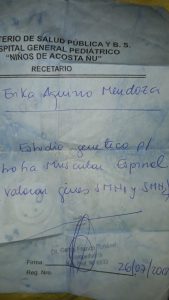 Felicita Mendoza de 41 años domiciliado en el Barrio Trigal 2 de Hernandarias, desesperada en busca de ayuda en costear estudios médicos para su hija Erika Andréa Aquino Mendoza de 1 año y 6 meses. Quien a los 6 meses perdió la fuerza en los huesos y en la cabeza por tal motivo actualmente está realizando un tratamiento en el Hospital Acosta Ñu, donde le solicitaron un estudio médico de Atrofia Muscular Espinal, que únicamente se podría hacer en el laboratorio Díaz Gill  de Asunción con un costo de 6.000.000Gs